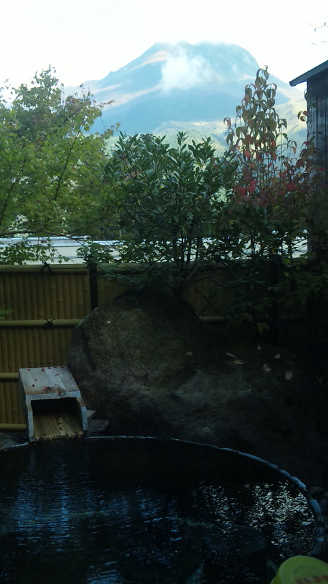 大きな酒樽の露天風呂の目の前は由布岳とういうロケーション。