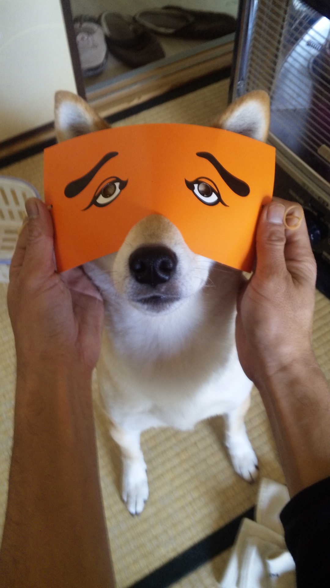博多にわかせんぺいのお面をかぶらされるなっちゃん。