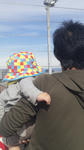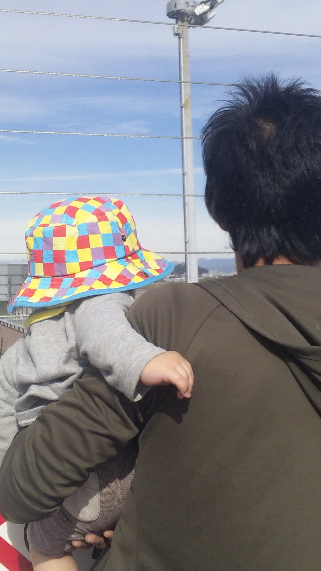 展望デッキからおばあちゃんを探すはるたとおとっさん。