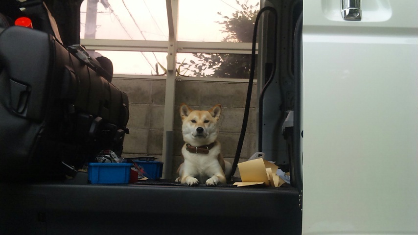 バイクでお買い物に出かけた先で、かわいいワンコに出会いましたよ。