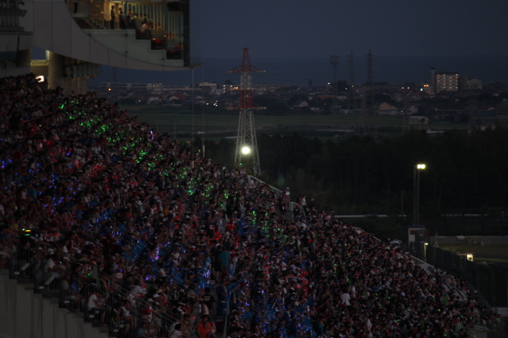 グランドスタンドはチームカラーのペンライトが