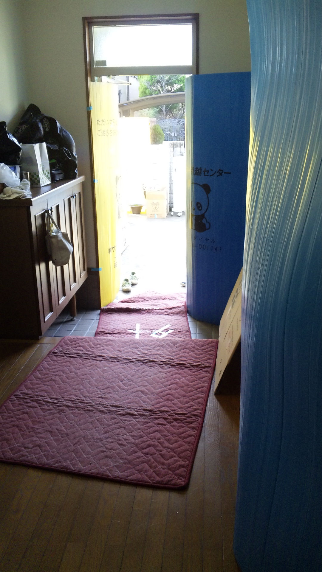 上の写真は玄関の様子。 ちゃんと壁には養生マットをあててくれております。