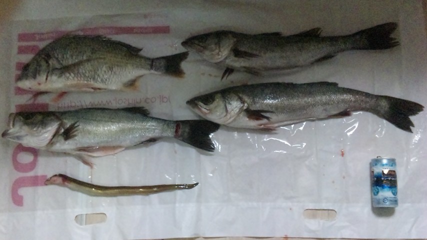 のスズキ3匹と、チヌ(クロダイ)1匹。 ひゃー!!