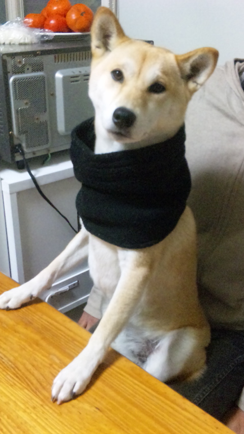 おとっさんのネックウォーマーをつけたなっちゃん。